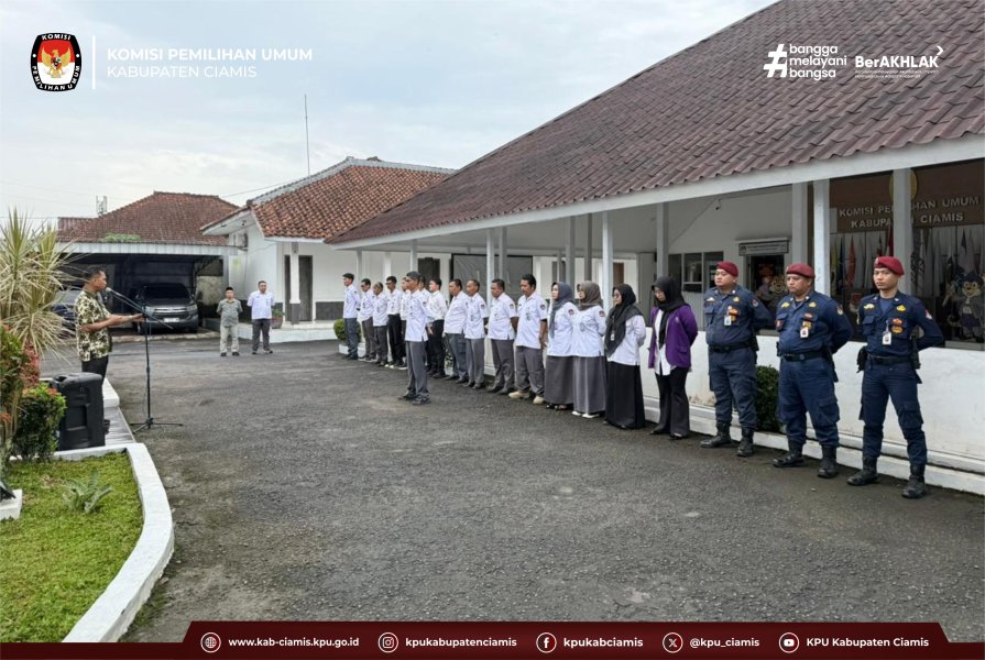 CIAMIS - KPU Kabupaten Ciamis melaksanakan apel pagi rutin pada Senin, 23 Februari 2026, di lingkungan Kantor KPU Kabupaten Ciamis. Apel pagi ini diikuti oleh Anggota KPU Kabupaten Ciamis serta staf sekretariat sebagai bagian dari kegiatan pembinaan kedisiplinan dan penguatan nilai-nilai kerja.