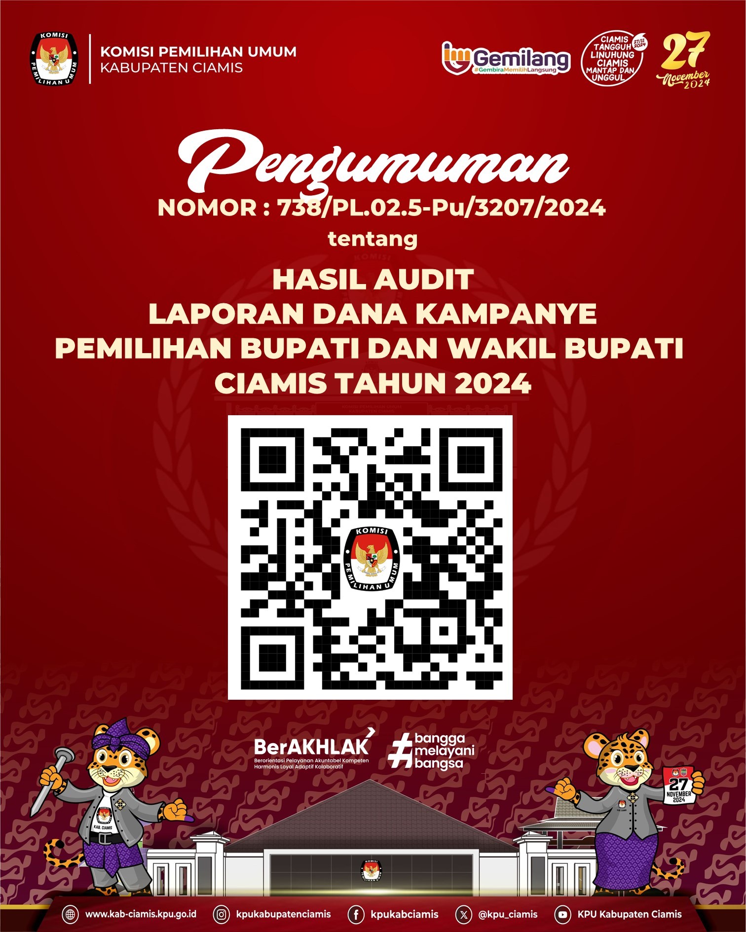 Berdasarkan tanda terima dan berita acara penerimaan hasil audit laporan dana kampanye pasangan calon dalam pemilihan bupati dan wakil bupati ciamis tahun 2024 di Komisi Pemilihan Umum Kabupaten Ciamis, bersama ini disampaikan Hasil Audit Laporan Dana Kampanye sebagaimana tercantum pada Pengumuman ini.