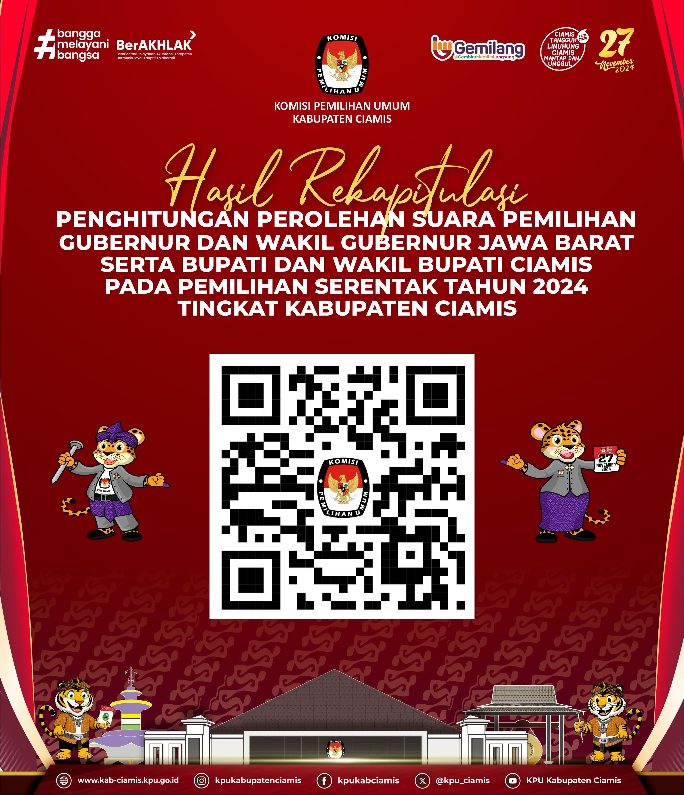 Berikut kami sampaikan Hasil Penghitungan Perolehan Suara Pemilihan Gubernur dan Wakil Gubernur Jawa Barat serta Bupati dan Wakil Bupati Ciamis dalam Pemilihan Serentak Tahun 2024 tingkat Kabupaten Ciamis.