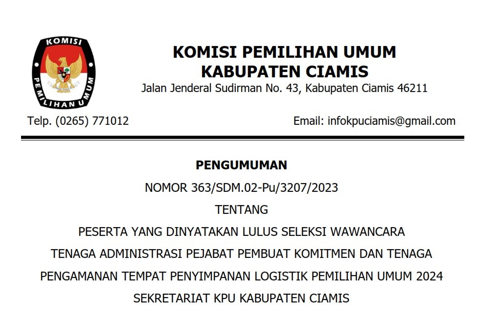 Hasil Seleksi Tenaga Administrasi Pejabat Pembuat Komitmen dan Tenaga Pengamanan Penyimpanan Logistik KPU Kabupaten Ciamis