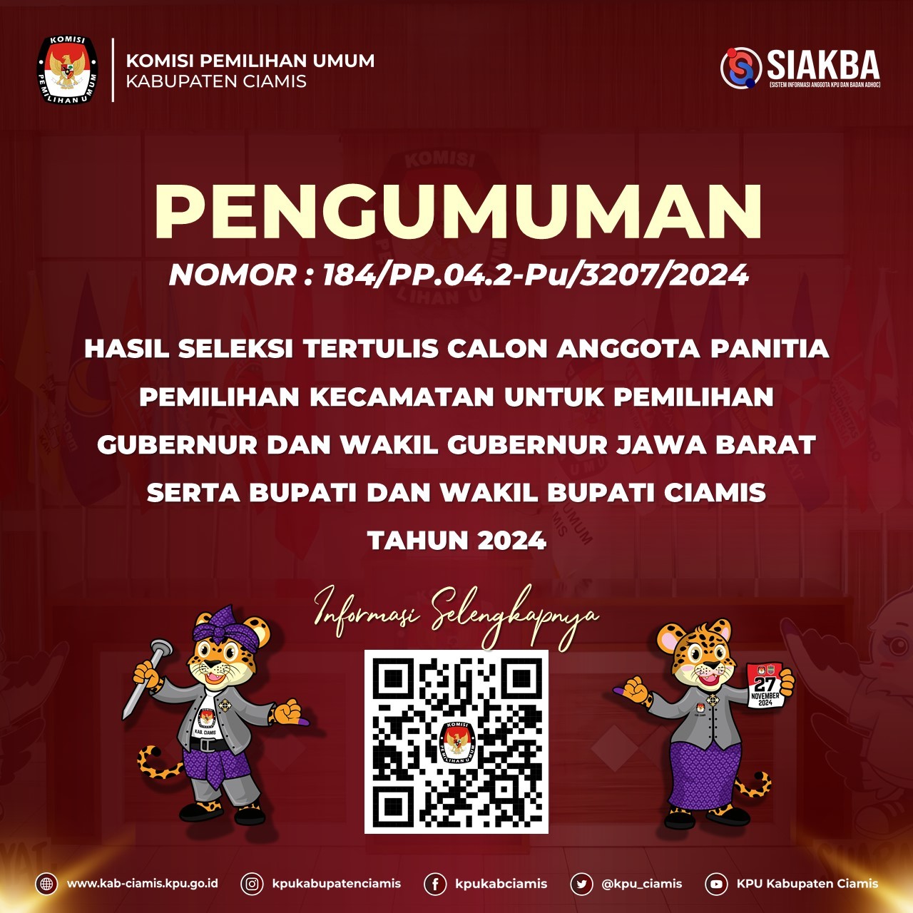 Sehubungan dengan Komisi Pemilihan Umum Kabupaten Ciamis telah melaksanakan tahapan Seleksi Tertulis Calon Anggota Panitia Pemilihan Kecamatan untuk Pemilihan Gubernur dan Wakil Gubernur Jawa Barat serta Bupati dan Wakil Bupati Ciamis Tahun 2024, berikut kami sampaikan Hasil Seleksi Tertulis beserta Jadwal Seleksi Wawancara untuk Calon Anggota Panitia Pemilihan Kecamatan untuk Pemilihan Gubernur dan Wakil Gubernur Jawa Barat serta Bupati dan Wakil Bupati Ciamis Tahun 2024.