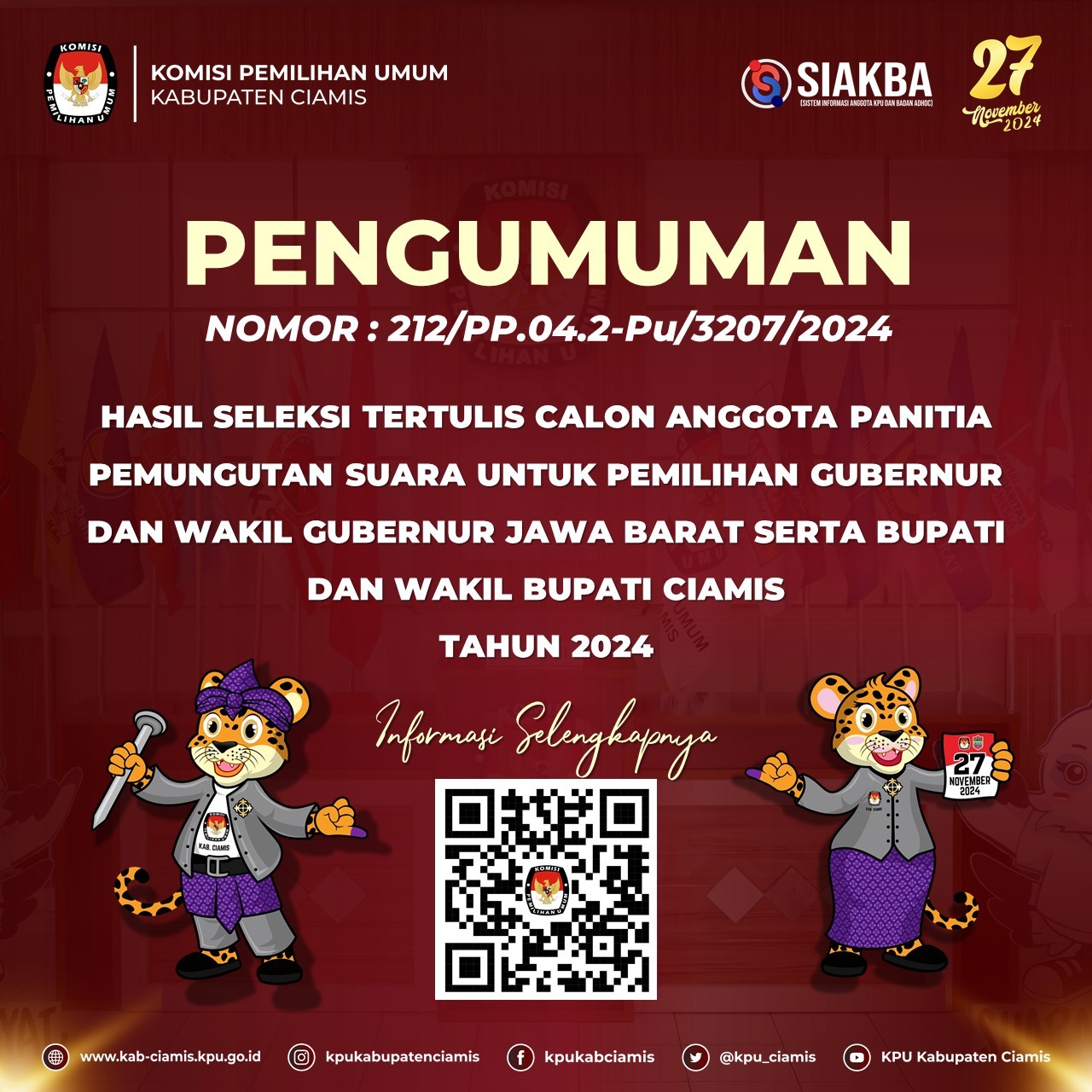 Sehubungan dengan Komisi Pemilihan Umum Kabupaten Ciamis telah melaksanakan tahapan Seleksi Tertulis Calon Anggota Panitia Pemungutan Suara untuk Pemilihan Gubernur dan Wakil Gubernur Jawa Barat serta Bupati dan Wakil Bupati Ciamis Tahun 2024, berikut kami sampaikan Hasil Seleksi Tertulis beserta Jadwal Seleksi Wawancara untuk Calon Anggota Panitia Pemungutan Suara untuk Pemilihan Gubernur dan Wakil Gubernur Jawa Barat serta Bupati dan Wakil Bupati Ciamis Tahun 2024.