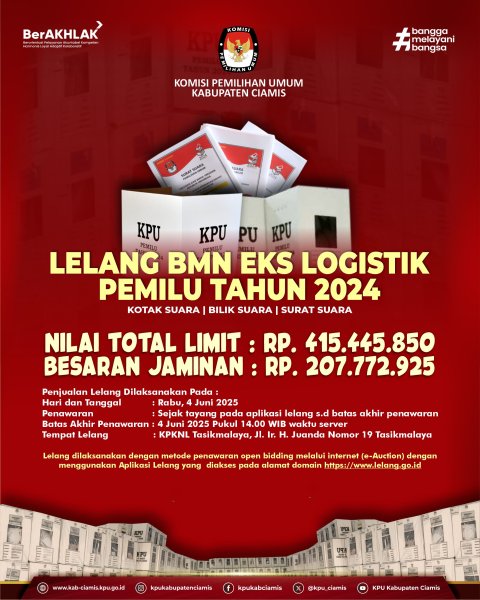 KPU Kabupaten Ciamis akan melaksanakan lelang Barang Milik Negara melalui perantaraan Kantor Pelayanan Kekayaan Negara dan Lelang (KPKNL) Tasikmalaya dengan cara penawaran terbuka (open bidding) melalui internet, dengan objek berupa Logistik Pasca Pemilu 2024 dengan rincian sebagai berikut :