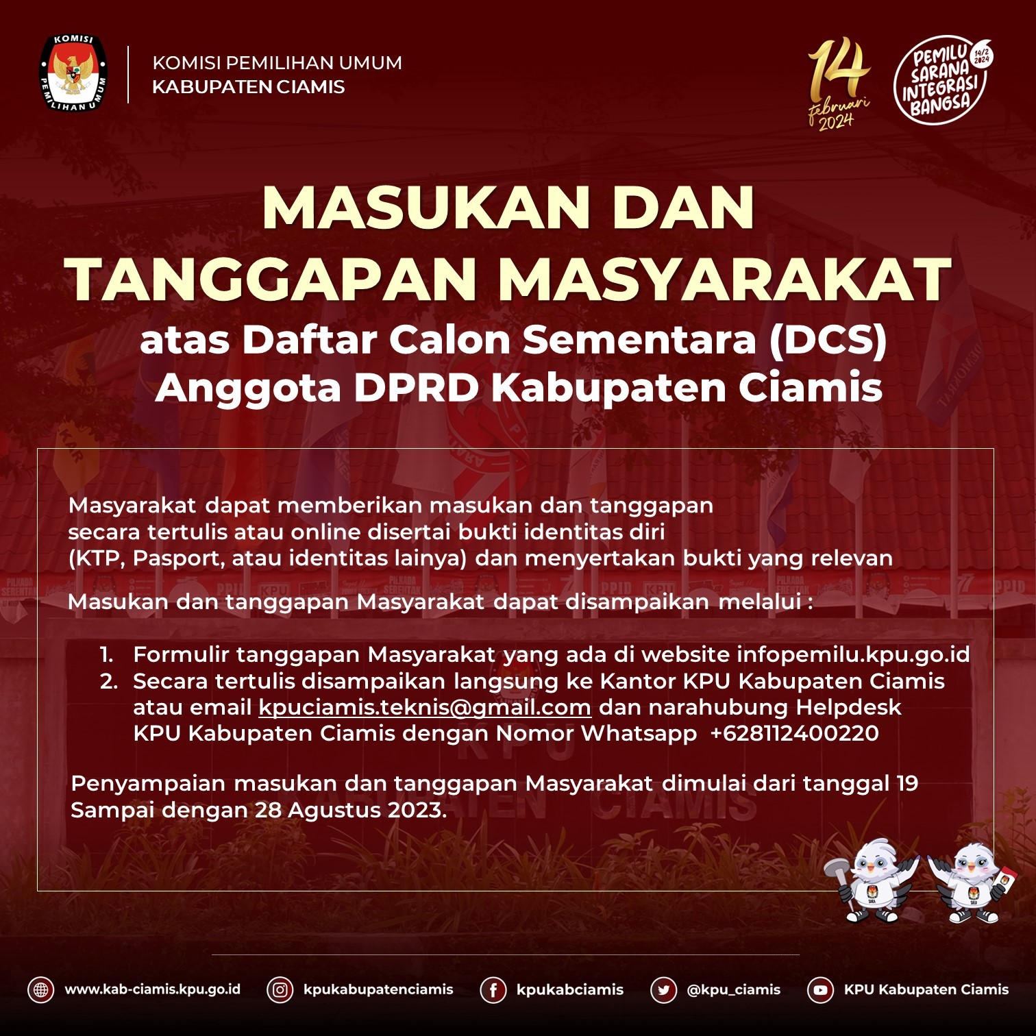 Sesuai dengan ketentuan Pasal 71 Peraturan KPU Nomor 10 Tahun 2023 tentang Pencalonan Anggota Dewan Perwakilan Rakyat, Dewan Perwakilan Rakyat Daerah Provinsi, dan Dewan Perwakilan Rakyat Daerah Kabupaten/Kota, bahwa masyarakat dapat menyampaikan masukan dan tanggapan terhadap calon sementara Anggota DPR, DPRD provinsi, dan DPRD kabupaten/kota yang tercantum dalam Daftar Calon Sementara (DCS) dari tanggal 19 - 28 Agustus 2023.
