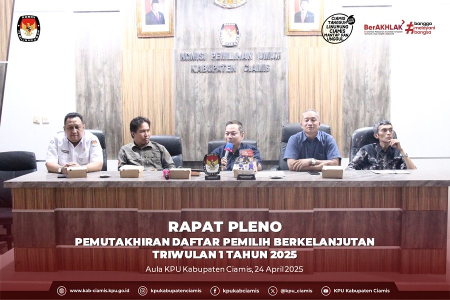 Kamis, 24 April 2025 bertempat di Aula KPU Kabupaten Ciamis, KPU Kabupaten Ciamis telah melaksanakan Rapat Pleno Pemutakhiran Daftar Pemilih Berkelanjutan Periode Triwulan 1 Tahun 2025. Rapat Pleno dipimpin langsung oleh Ketua KPU Kabupaten Ciamis yang didampingi oleh Anggota KPU Divisi Perencanaan Data dan Informasi, Anggota KPU Divisi Sosialisasi Pendidikan Pemilih Partisipasi Masyrakat dan SDM, Anggota KPU Divisi Hukum Pengawasan, Sekretaris KPU Kabupaten Ciamis dan Jajaran Sekretariat KPU Kabupaten Ciamis. Hadir juga pada Rapat Pleno tersebut yaitu Bawaslu Kabupaten Ciamis, dan Dinas Kependudukan dan Catatan Sipil Kabupaten Ciamis.
