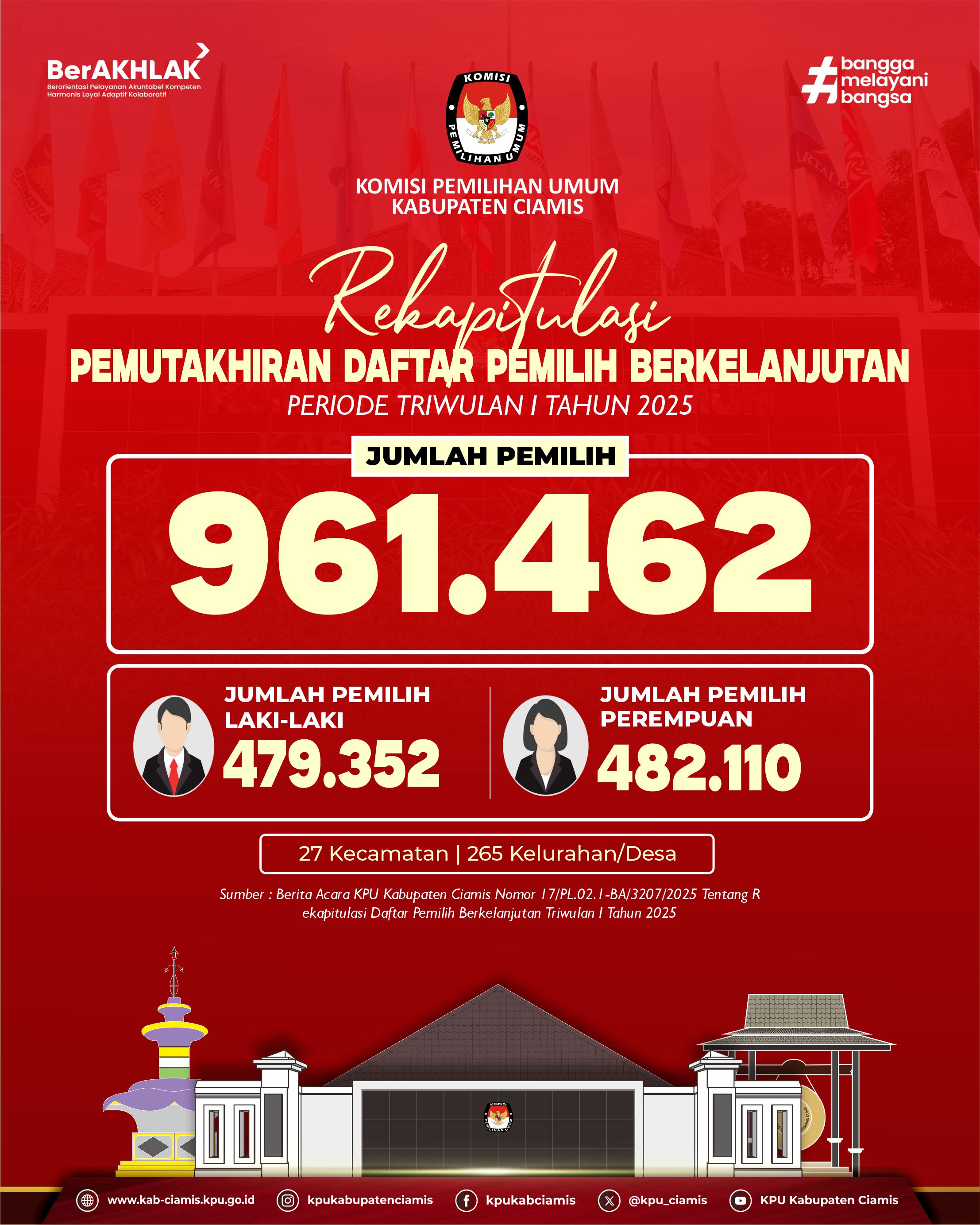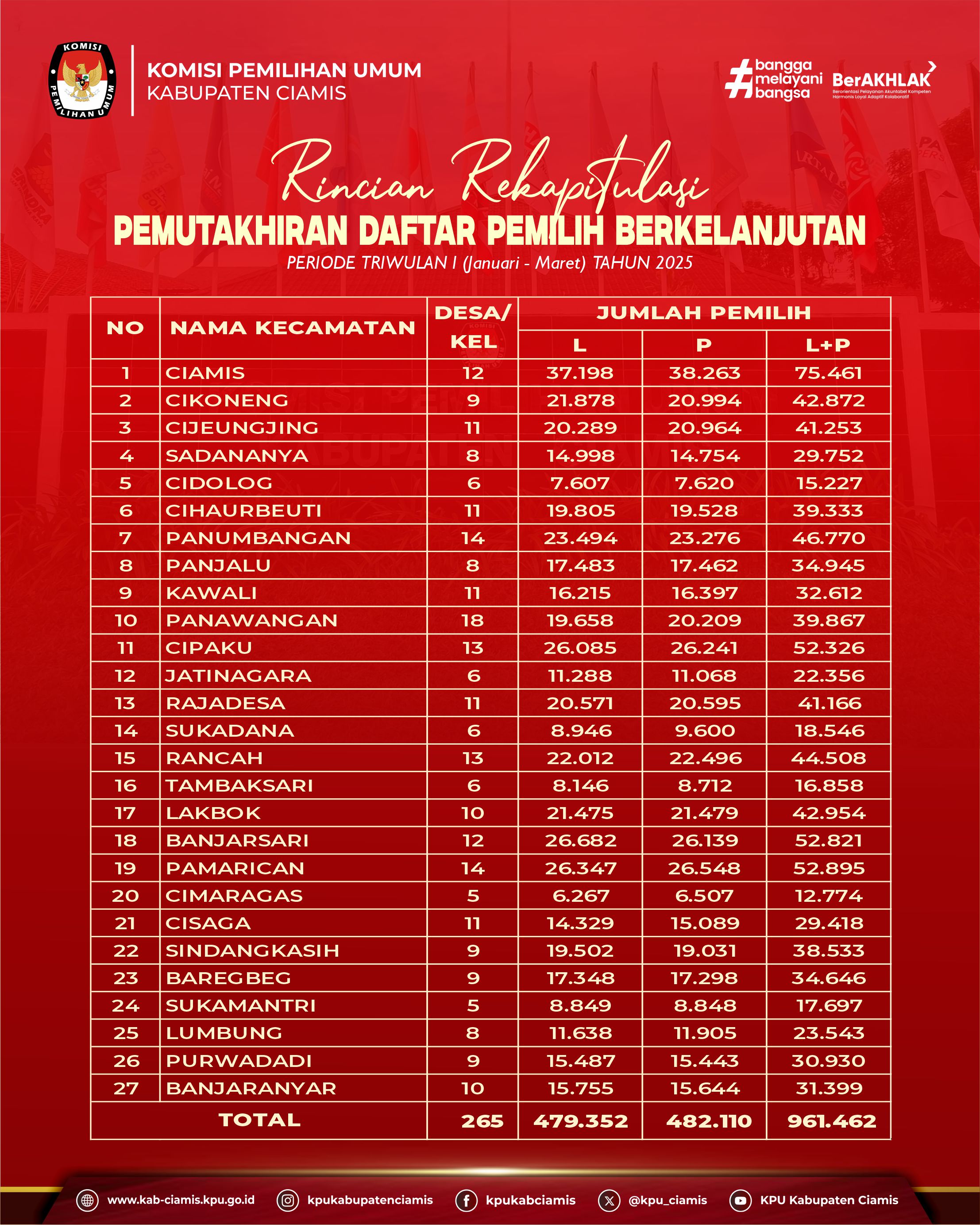 Rapat Pleno Pemutakhiran Daftar Pemilih tersebut selanjutnya dituangkan dan ditetapkan pada Berita Acara Rapat Pleno KPU Kabupaten Ciamis Nomor 17/PL.02.1-BA/3207/2025 tentang Rekapitulasi Daftar Pemilih Berkelanjutan Triwulan 1 Tahun 2025 dengan rincian sebagai berikut :