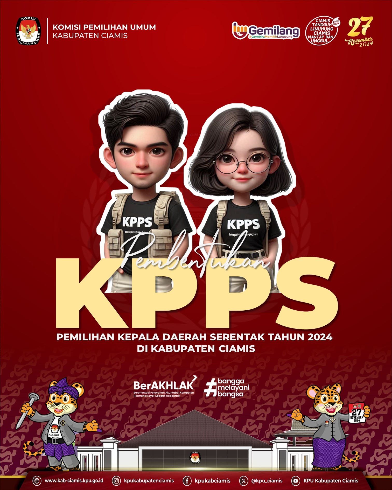 Dalam rangka pembentukan Calon Anggota Kelompok Penyelenggara Pemungutan Suara (KPPS) untuk Pemilihan Gubernur dan Wakil Gubernur Jawa Barat, serta Bupati dan Wakil Bupati Ciamis Tahun 2024, Komisi Pemilihan Umum Kabupaten Ciamis mengundang Warga Negara Indonesia yang memenuhi persyaratan untuk mendaftarkan diri menjadi KPPS untuk Pemilihan Gubernur dan Wakil Gubernur Jawa Barat, serta Bupati dan Wakil Bupati Ciamis Tahun 2024.