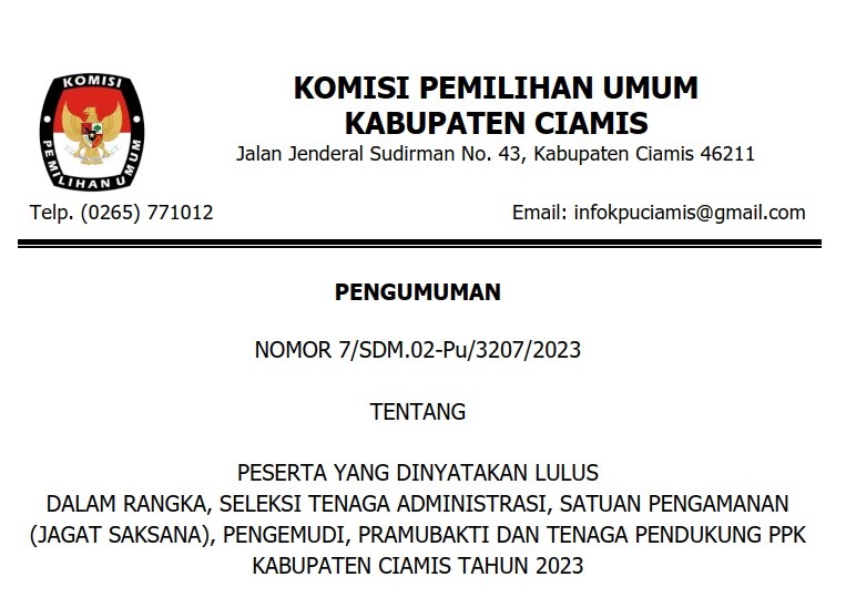 Berdasarkan hasil Seleksi Tenaga Administrasi, Satuan Pengamanan (Jagat Saksana), Pengemudi, Pramubakti dan Tenaga Pendukung PPK pada Sekretariat KPU Kabupaten Ciamis, diumumkan bahwa peserta sesuai lampiran dinyatakan LULUS.