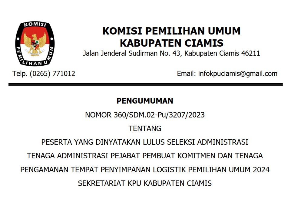 PENGUMUMAN HASIL SELEKSI ADMINISTRASI TENAGA ADMINISTRASI PEJABAT PEMBUAT KOMITMEN DAN TENAGA PENGAMANAN TEMPAT PENYIMPANAN LOGISTIK PEMILIHAN UMUM 2024 SEKRETARIAT KPU KABUPATEN CIAMIS