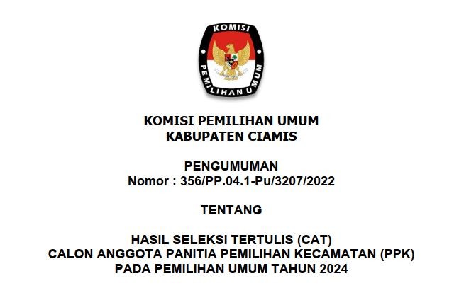 kab-ciamis.kpu.go.id - Berdasarkan Berita Acara Komisi Pemilihan Umum Kabupaten Ciamis Nomor 38/PP.04.1-BA/3207/2022 tanggal 8 Desember 2022 tentang Hasil Seleksi Tertulis Calon Anggota Panitia Pemilihan Kecamatan (PPK) pada Pemilihan Umum Tahun 2024, maka dapat kami sampaikan hal-hal sebagai berikut :