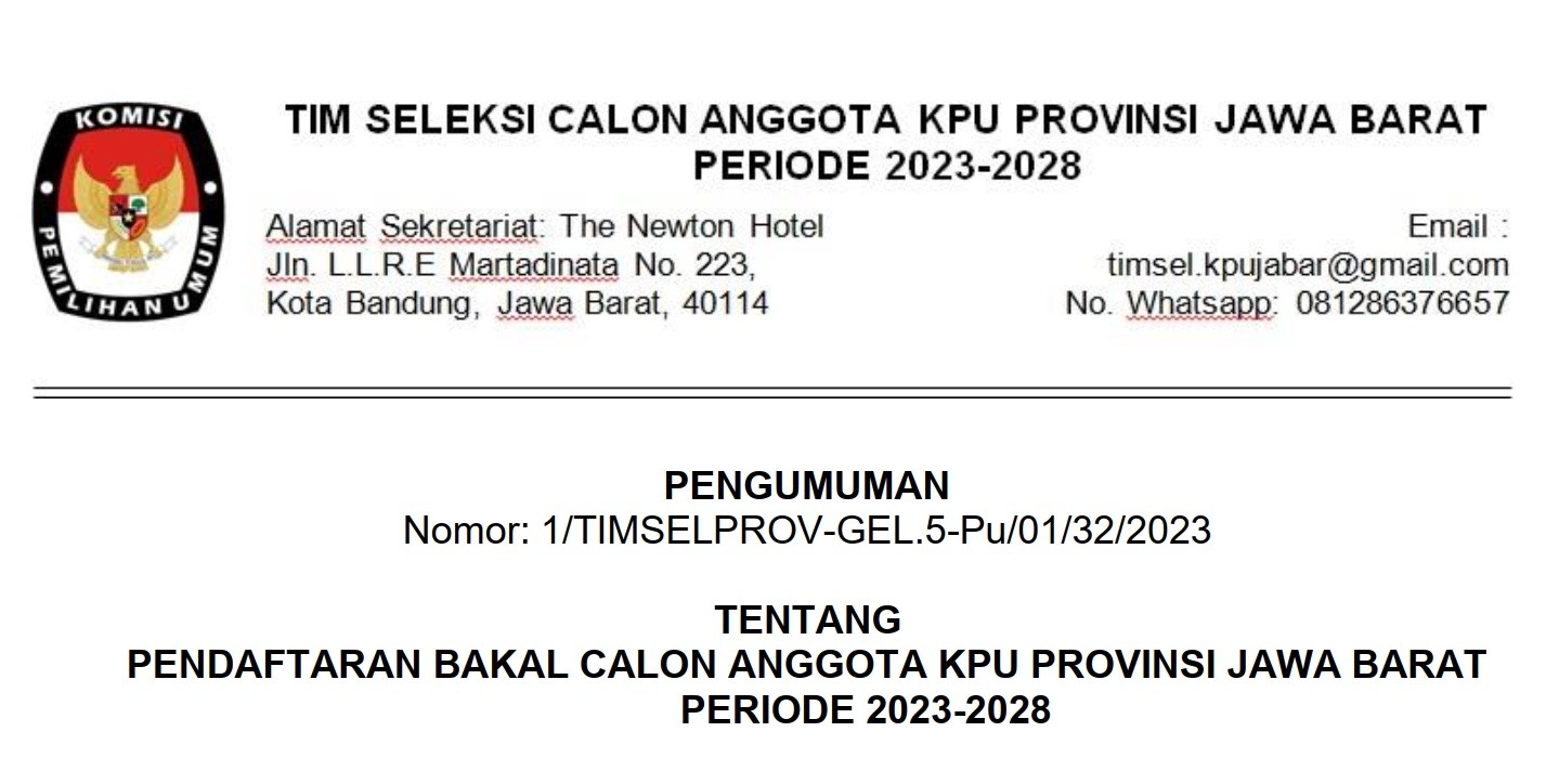 PENGUMUMAN PENDAFTARAN BAKAL CALON ANGGOTA KPU PROVINSI JAWA BARAT PERIODE 2023-2028