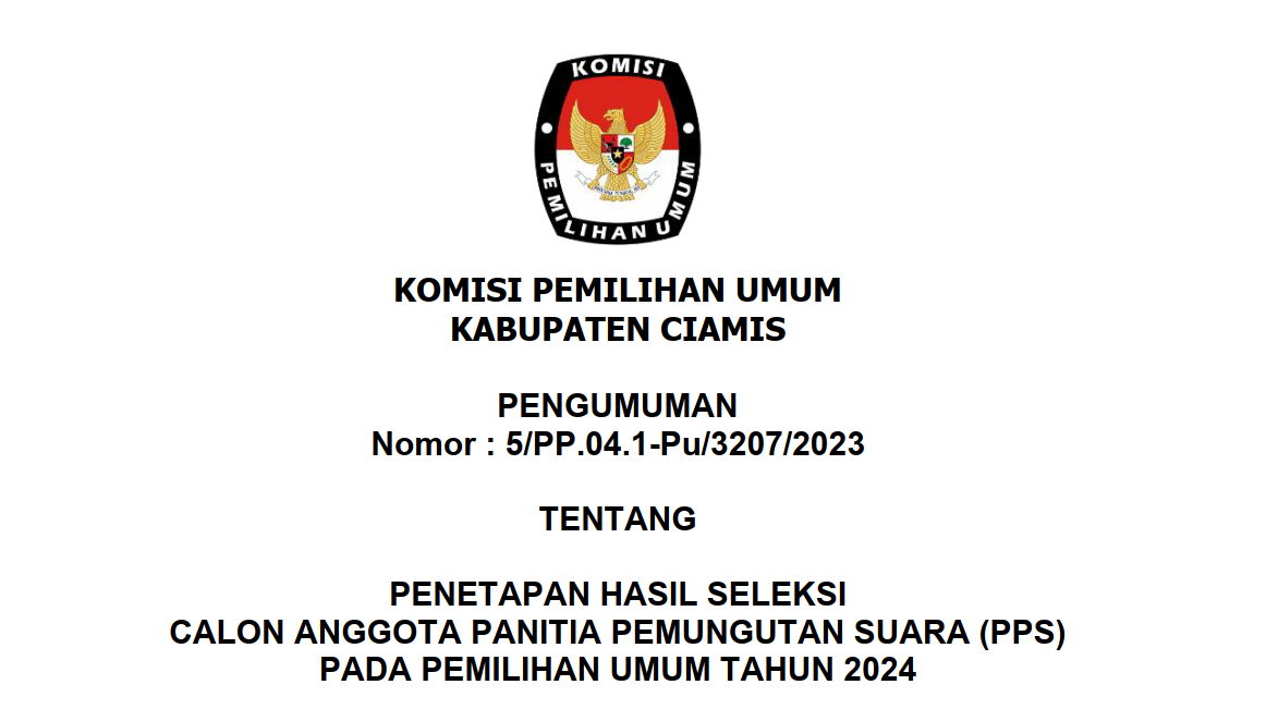 kab-ciamis.kpu.go.id - Berdasarkan Berita Acara Komisi Pemilihan Umum Kabupaten Ciamis Nomor 57/PP.04.1-BA/3207/2023 tanggal 23 Januari 2023 tentang Penetapan Hasil Seleksi Calon Anggota Panitia Pemungutan Suara (PPS) pada Pemilihan Umum Tahun 2024, maka dapat kami sampaikan hal-hal sebagai berikut :