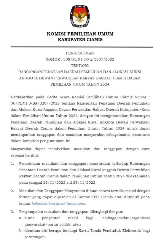 Berdasarkan pada Berita Acara Komisi Pemilihan Umum Kabupaten Ciamis Nomor : 36/PL.01.3-BA/3207/2022 tentang Rancangan Penataan Daerah Pemilihan dan Alokasi Kursi Anggota Dewan Perwakilan Rakyat Daerah Kabupaten/Kota dalam Pemilihan Umum Tahun 2024, dengan ini mengumumkan Rancangan Penataan Daerah Pemilihan dan Alokasi Kursi Anggota Dewan Perwakilan Rakyat Daerah Ciamis dalam Pemilihan Umum Tahun 2024 untuk dapat mendapatkan tanggapan dan masukan masyarakat sebagaimana tercantum dalam lampiran pengumuman ini.