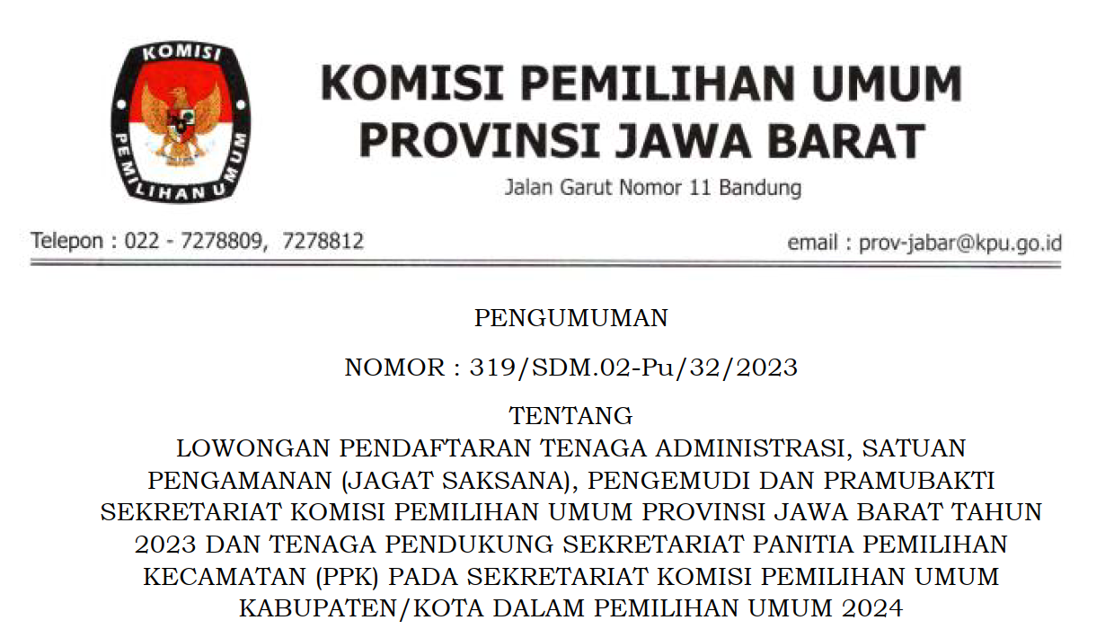 REKRUTMEN PENDAFTARAN TENAGA ADMINISTRASI, SATUAN PENGAMANAN (JAGAT SAKSANA), PENGEMUDI DAN PRAMUBAKTI SEKRETARIAT KOMISI PEMILIHAN UMUM PROVINSI JAWA BARAT TAHUN 2023 DAN TENAGA PENDUKUNG SEKRETARIAT PANITIA PEMILIHAN KECAMATAN (PPK) PADA SEKRETARIAT KOMISI PEMILIHAN UMUM KABUPATEN/KOTA DALAM PEMILIHAN UMUM 2024