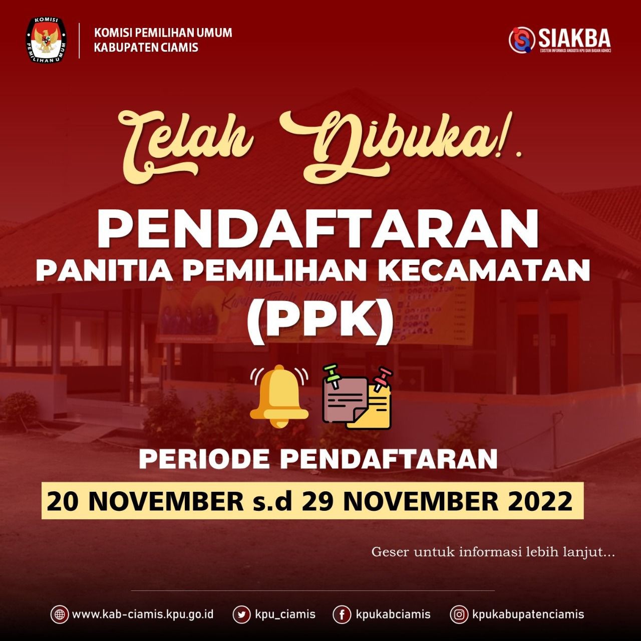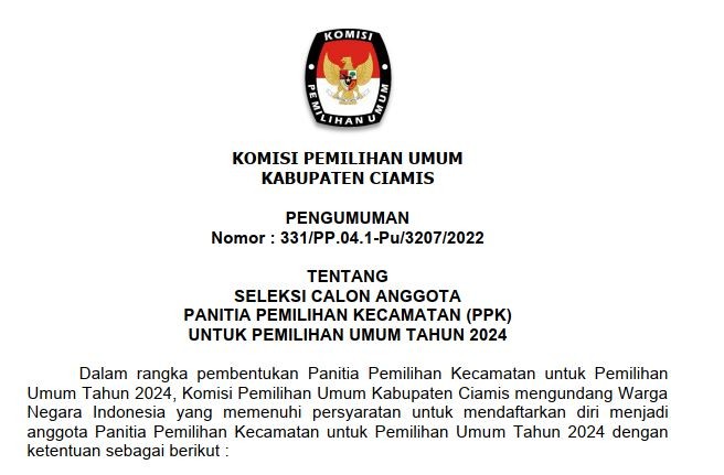 Komisi Pemilihan Umum Kabupaten Ciamis mengundang Warga Negara Indonesia yang memenuhi persyaratan untuk mendaftarkan diri menjadi anggota Badan Adhoc Panitia Pemilihan Kecamatan untuk Pemilihan Umum Tahun 2024.