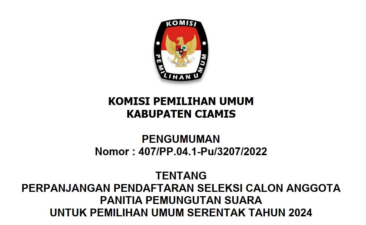 Sehubungan dengan hal tersebut, KPU Kabupaten Ciamis membuka perpanjangan waktu pendaftaran seleksi calon anggota Panitia Pemungutan Suara pada kelurahan/desa yang tercantum pada pengumuman mulai 31 Desember 2022 sd 2 Januari 2023.