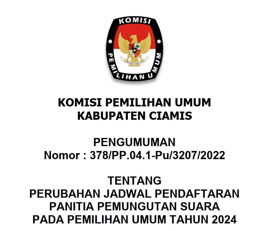 kab-ciamis.kpu.go.id - Berikut kami sampaikan Perubahan Tahapan dan Jadwal Pembentukan Panitia Pemungutan Suara (PPS) untuk Pemilu 2024 sesuai Surat Keputusan KPU RI Nomor 534 Tahun 2022.