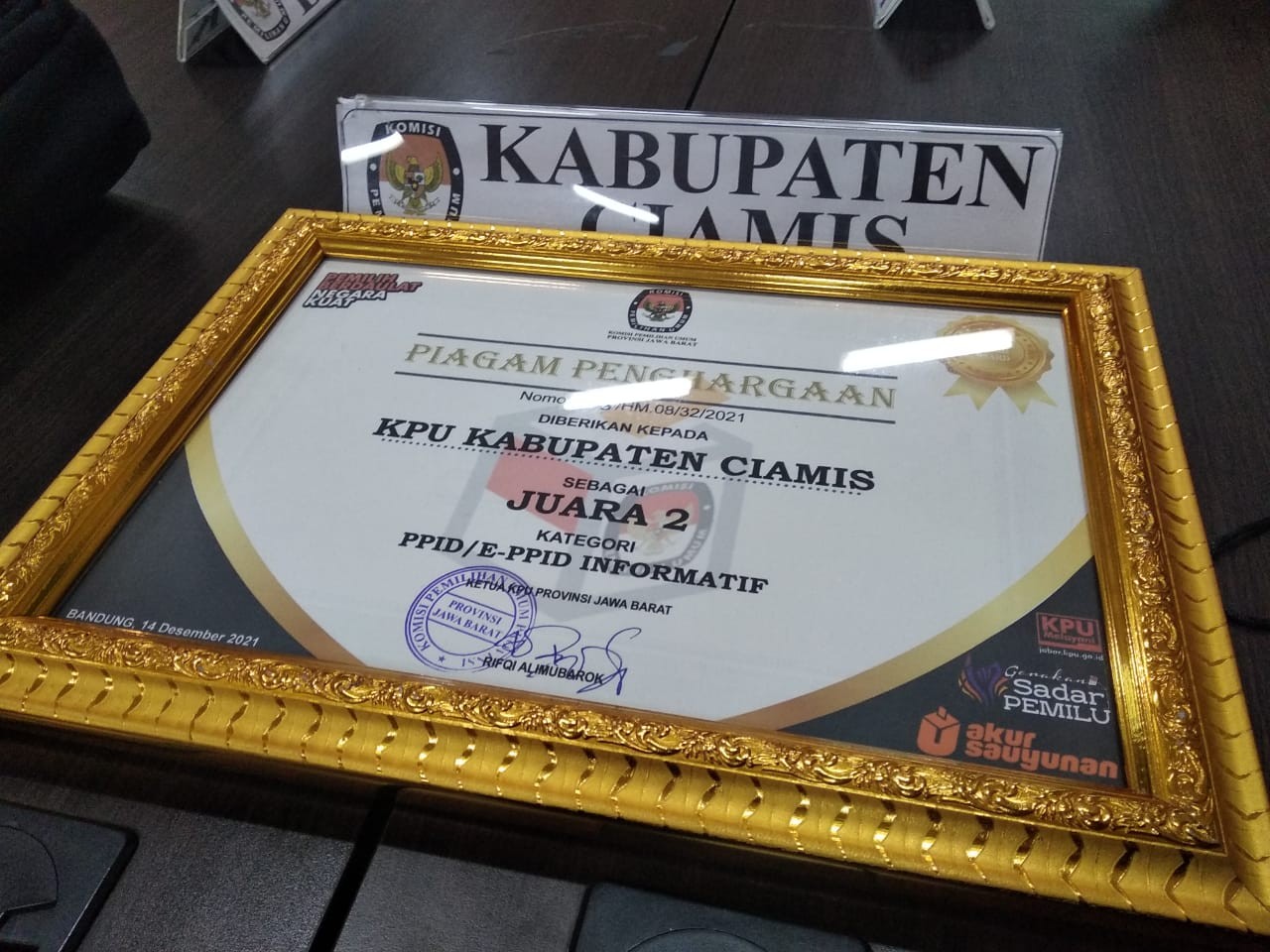 Bandung, kab-ciamis.kpu.go.id - Selasa, 14 Desember 2021 KPU Kabupaten Ciamis meraih penghargaan JUARA 2 Kategori E-PPID TER-INFORMATIF Pada Kegiatan "PENGHARGAAN TAHUNAN (ANNUAL AWARD) KPU PROVINSI JAWA BARAT : Pengelola PPID, RPP, WEBSITE, Sosialisasi Dan Pendidikan Pemilih Berkelanjutan KPU Kabupaten/Kota Se Jawa Barat".