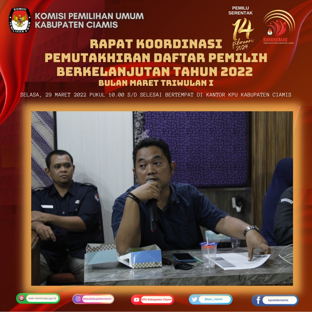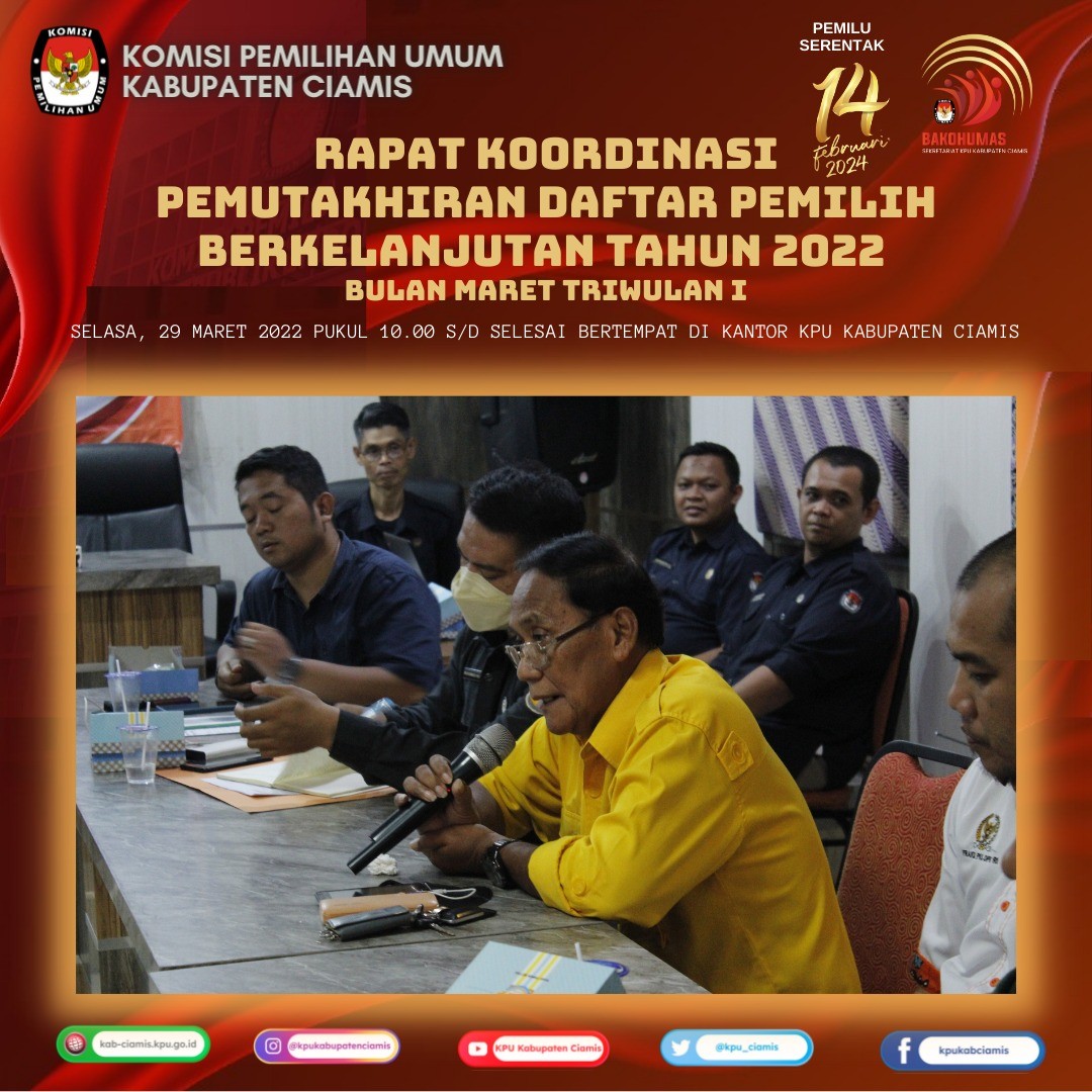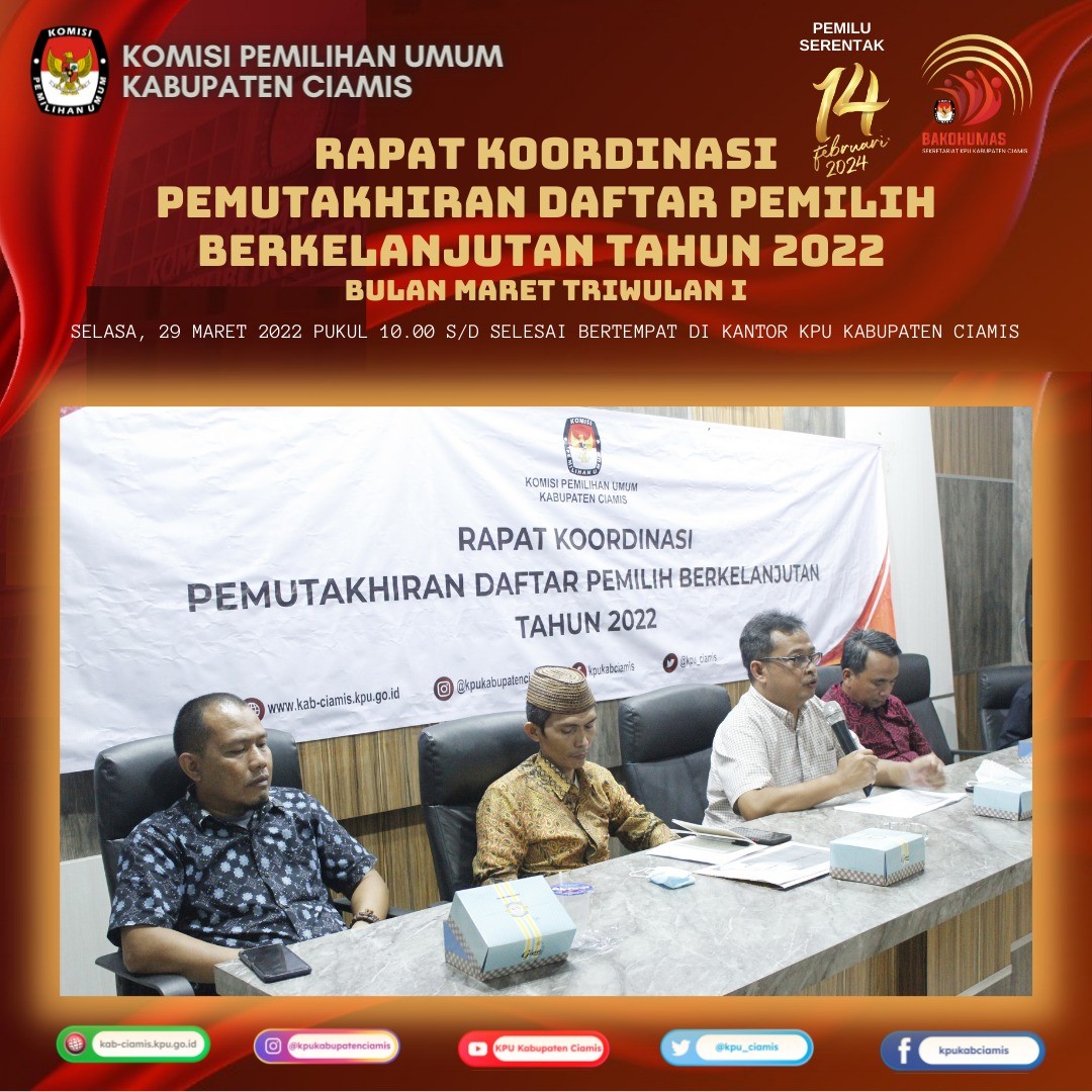 kab-ciamis.kpu.go.id - Selasa, 29 Maret 2022 KPU Kabupaten Ciamis telah melaksanakan Rapat Koordinasi Pemutakhiran Daftar Pemilih Berkelanjutan Tahun 2022 Periode Bulan Maret / Triwulan I bertempat di Aula KPU Kabupaten Ciamis.