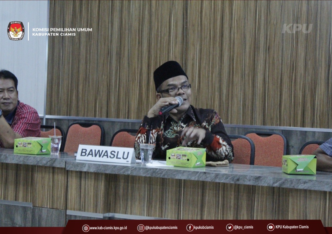 Rapat dihadiri Jajaran Komisioner, PLT. Sekretaris dan Para Kasubag dengan mengundang Bawaslu, Partai Politik dan Instansi terkait yang terdiri dari Dandim 0613, Polres, Partai Politik, Bawaslu, Kemenag, Pengadilan Negeri Ciamis, Kantor Cabang Dinas Pendidikan Wilayah XIII, Lembaga Pemasyarakatan.