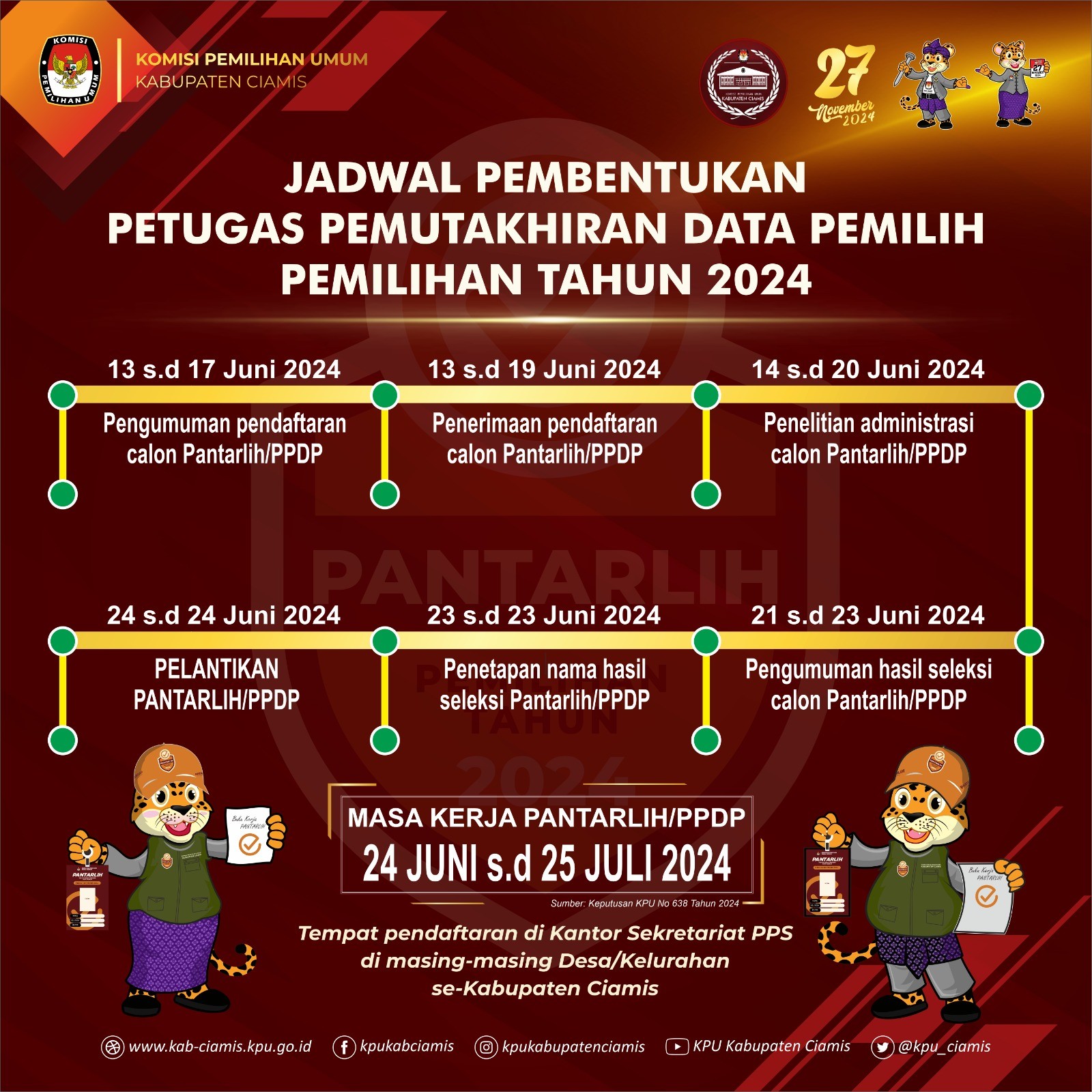 Dalam rangka pembentukan Calon Petugas Pemutakhiran Data Pemilih (PANTARLIH) untuk Pemilihan Gubernur dan Wakil Gubernur Jawa Barat, serta Bupati dan Wakil Bupati Ciamis Tahun 2024, Komisi Pemilihan Umum Kabupaten Ciamis mengundang Warga Negara Indonesia yang memenuhi persyaratan untuk mendaftarkan diri menjadi Petugas Pemutakhiran Data Pemilih untuk Pemilihan Gubernur dan Wakil Gubernur Jawa Barat, serta Bupati dan Wakil Bupati Ciamis Tahun 2024.