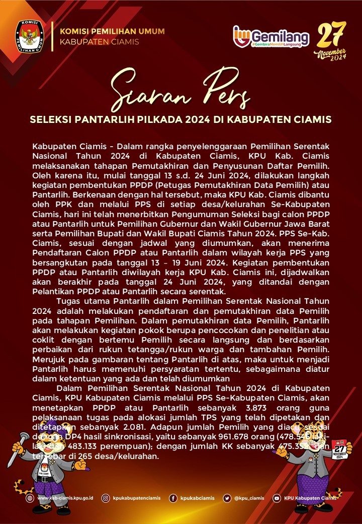 Berikut Siaran Pers Komisi Pemilihan Umum Kabupaten Ciamis berkaitan dengan Pembentukan Petugas Pemutakhiran Data Pemilih untuk Pemilihan Kepala Daerah Tahun 2024 di Kabupaten Ciamis.